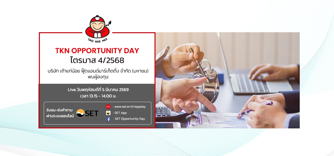 13:15 - 14:00 น. โดยรับชมการถ่ายทอดสดผ่านทางเว็บไซต์ของตลาดหลักทรัพย์แห่งประเทศไทย https://listed-company-presentation.setgroup.or.th/oppday